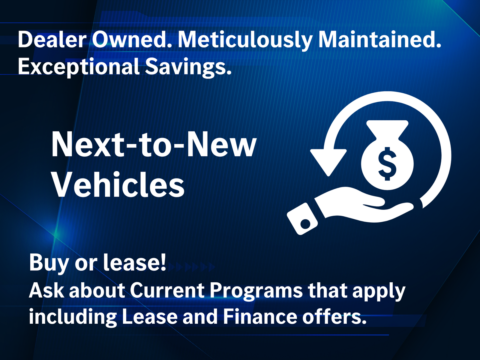 Prices do not include additional fees and costs of closing, including government fees and taxes, any finance charges, any dealer documentation fees, any emissions testing fees or other fees. All prices, specifications and availability subject to change without notice. Contact dealer for most current information. Prices are valid thru the close of business, today only.